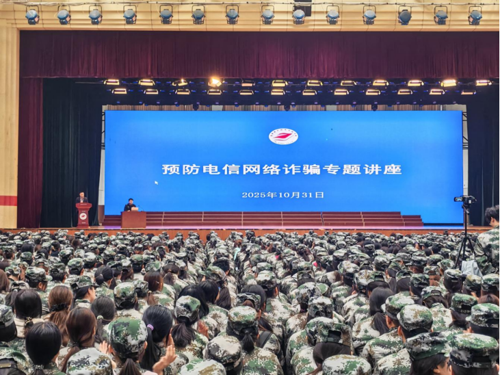 防范电信网络诈骗宣讲进军训。淄川公安分局反诈中心谷警官系统介绍了刷单返利、虚假网络投资理财、网络贷款诈骗、冒充公检法诈骗及网络游戏产品虚假交易等十类常见诈骗形式。通过真实案例,生动讲解了防范要点与相关法律法规,提醒学生警惕陌生来电和信息,切实增强了学生识别与应对诈骗的能力,营造了“人人识诈、人人反诈”的校园氛围。