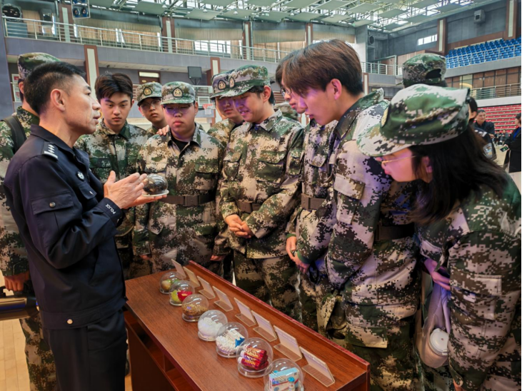 禁毒宣传进军训。民警针对学生好奇心强、辨别力较弱的特点,深入揭示了“跳跳糖”“奶茶”“开心水”等新型毒品的伪装形式,并结合案例剖析毒品危害,传授防毒拒毒知识,提醒学生增强警惕,不轻信陌生人,不随意接受陌生食物。