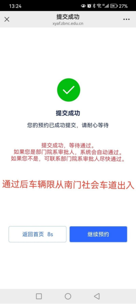 11显示“提交成功”,待审批通过后从南门社会车道出入校园。